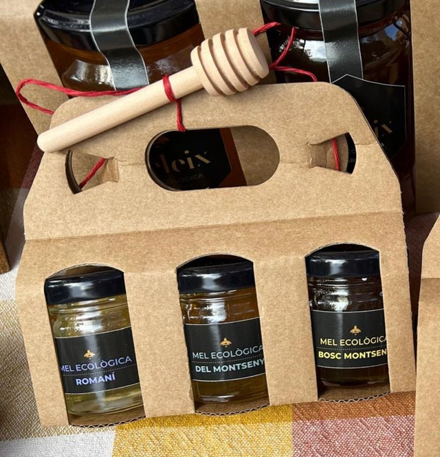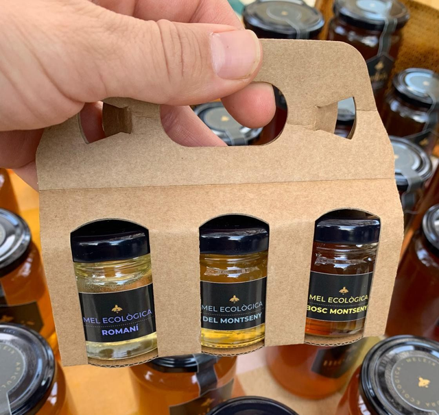 Estoig de cartró petit amb 3 pots de mel ecològica de 45 g.